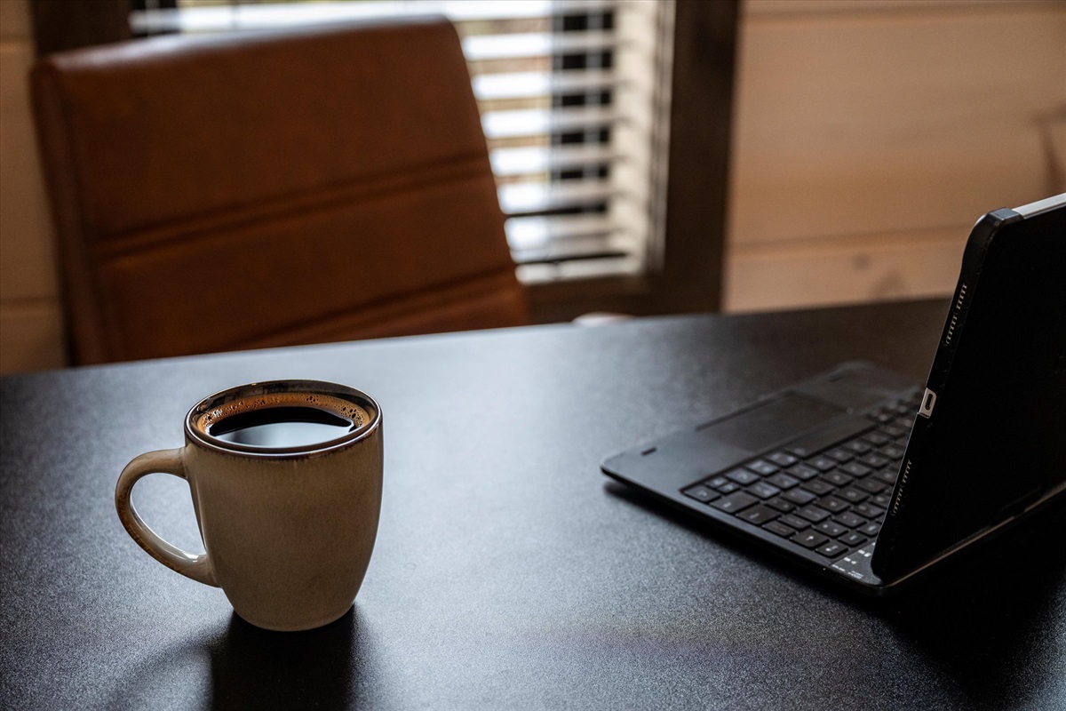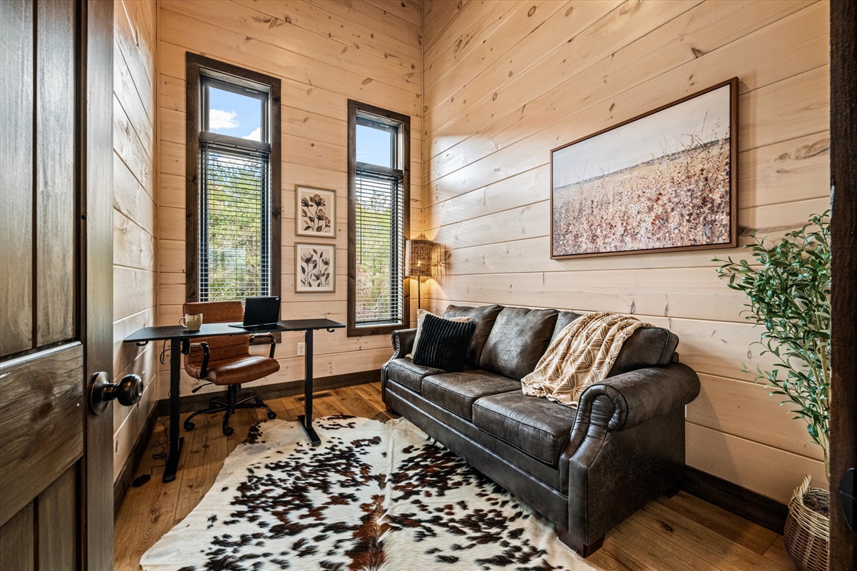 A dedicated workspace with desk and chair allows guests to work remotely while enjoying the mountain setting — a valuable feature for longer stays and corporate retreats.